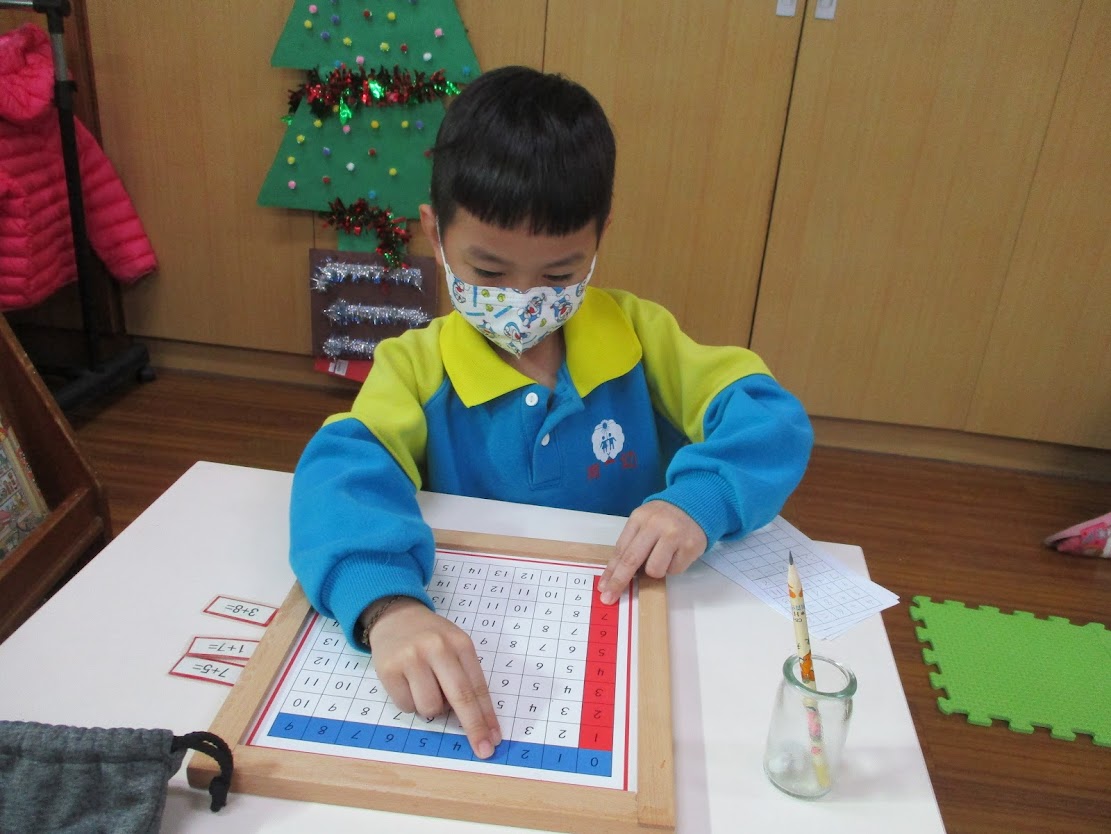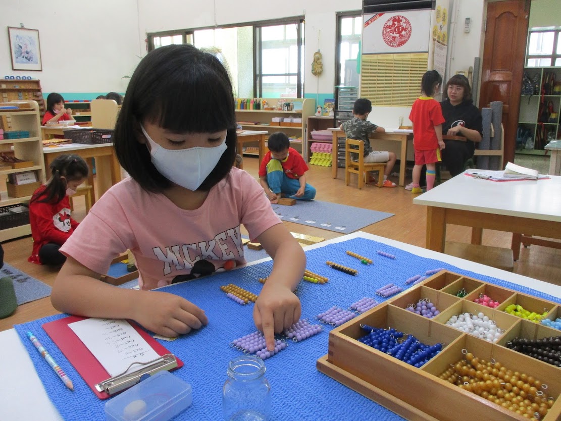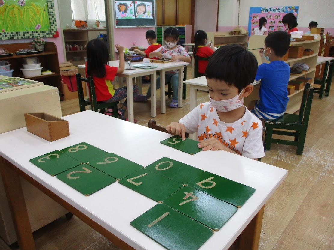孩子從感官教育中得到抽象概念、邏輯思考的能力,再輔以具體的數學教育讓孩子認識量和數字符號。從1~10延伸至一、十、百、千等十進位概念,以量的合成與分解來幫助孩子進入加、減、乘、除的抽象思考,用活潑有趣的活動來建構完整的數學概念